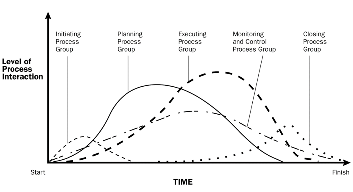 The different project management process groups interact and overlap as shown below: